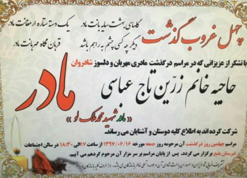 – مراسم هفتم روز شنبه ۳۰ تیر ماه از ساعت ۱۸ الی ۱۹/۳۰ در مسجد الزهرا (س) در خیابان شریعتی بالاتر از سید خندان خیابان حاج عبداله انصاری خیابان شهید عراقی منعقد می باشد.