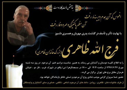 آقای فرج فرج الله ظاهری فرزند مرحوم اسدالله ظاهری به لقا حق پیوست .مراسم تشییع و خاکسپاری روز یکشنبه ۱۱صبح از غسالخانه بهشت زهرا انجام می گردد.