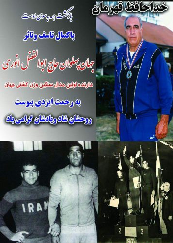 با کمال تاسف و تاثر درگذشت جهان پهلوان حاج ابوالفضل انوری افتخار ایران و بخش نوبران را خدمت یکایک اهالی محترم سامان و خانواده آنمرحوم تسلیت عرض می نماییم و در غمتان شریک می باشیم.